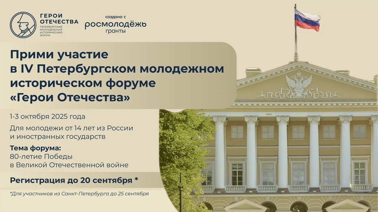 В период с 1 по 3 октября 2025 года в городе Санкт-Петербурге пройдет IV Петербургский молодежный исторический форум «Герои Отечества» по инициативе команды школьников и студентов при поддержке Министерства просвещения Российской Федерации, Федерального агентства по делам молодёжи, Российского исторического общества, «Движение Первых», депутатов Государственной Думы и сенаторов Российской Федерации.